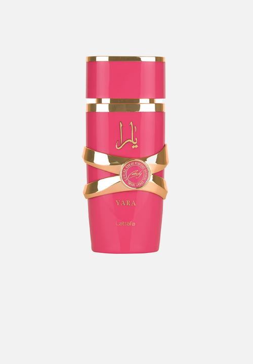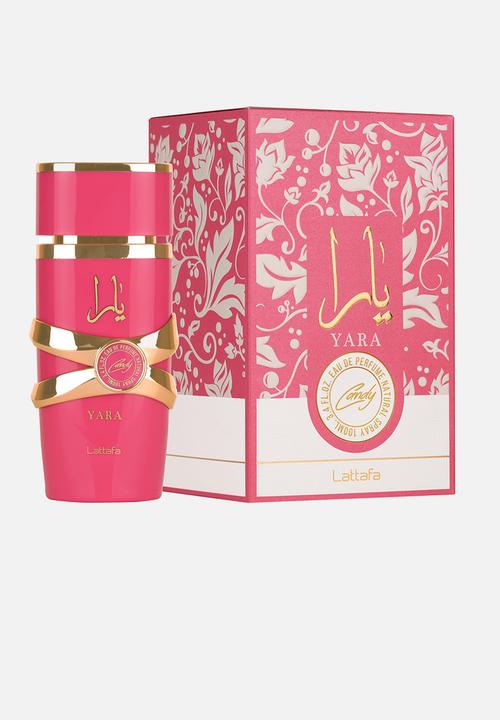 This fragrance is an Eau de Parfum for women, often described as a fruity amber scent. The name “Yara” is written in both English and Arabic script on the bottle. It was launched in 2022 and has notes of peach, jasmine, caramel, amber, sandalwood, and patchouli.